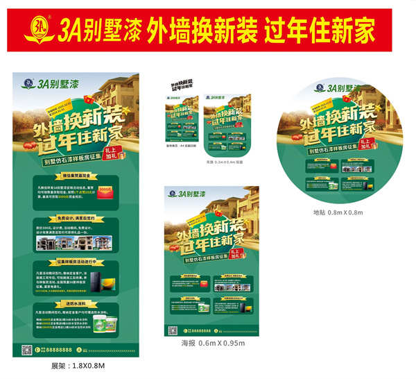 歲末年初之際,外出務工人員陸續返鄉過年,加上雙旦與春節,是建材行業銷售黃金高峰期,消費者在裝修中購買涂料的需求增加,年終大促一觸即發。希望全國經銷商,共同努力,如需制作,可按照下方鏈接指引下載文件:3A別墅漆《外墻換新裝,過年住新家》年終大促、3A環保漆《過年住新家,涂裝選好漆》年終大促。