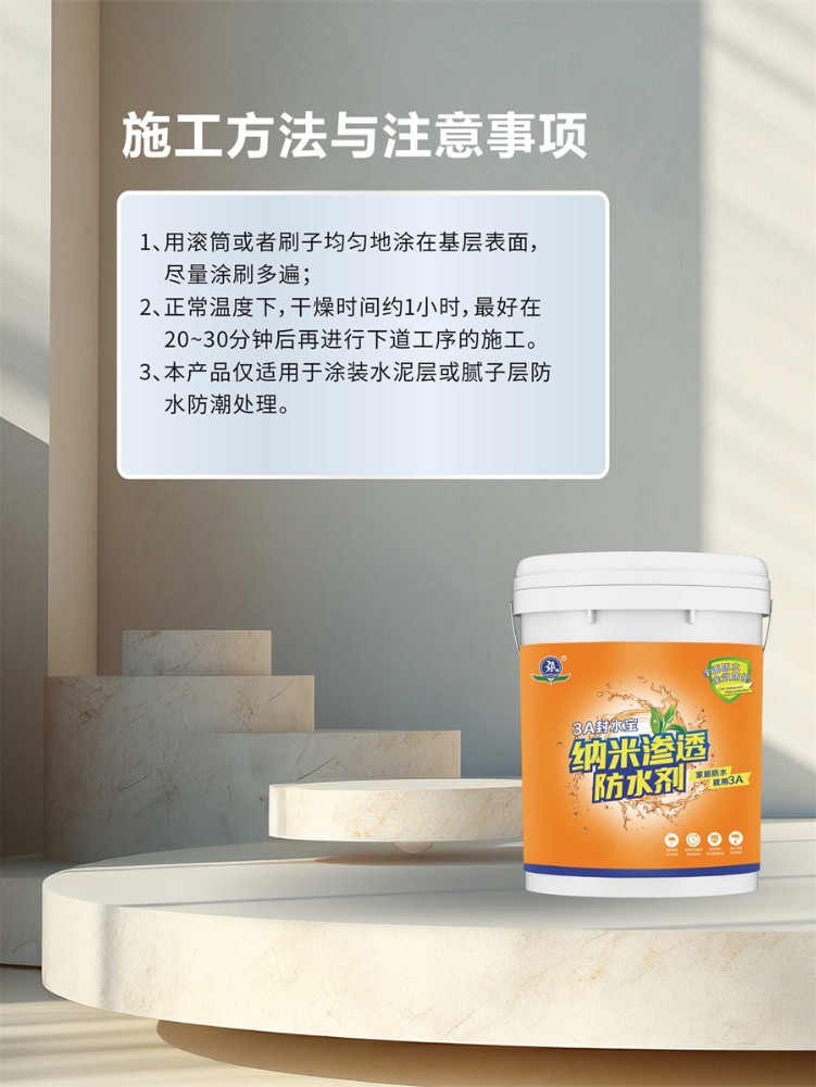 3A封水寶納米滲透防水劑采用專用納米分子合成樹脂乳液經(jīng)過多道工序制作而成,具有良好的耐水防潮、抗堿、耐濕熱和優(yōu)良的抗凍融性,操作簡便,無毒無味。適用于混凝土、加氣混凝土、墻面批刮膩子或抹灰前基層的密實(或拉毛)處理;適用于所有的新舊水泥砂漿基面的處理。處理過的墻面和地面,更適合進行貼磚、貼墻紙或做木墻板等裝飾。